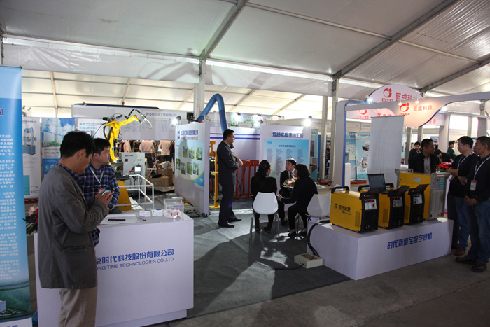 時(shí)代焊機作為職業(yè)教育領(lǐng)域的優(yōu)秀焊接設備供應商應邀參加了本屆展會(huì )。展會(huì )的展位都設置在組委會(huì )搭建的臨時(shí)性展棚中,時(shí)代展臺的位置在C館的中央。展會(huì )中只有三家企業(yè)與焊接專(zhuān)業(yè)相關(guān),時(shí)代是唯一一家專(zhuān)業(yè)焊接設備制造企業(yè),其余兩家都是焊接模擬培訓儀的廠(chǎng)家。時(shí)代的展品以全新TD系列焊機集控系統、弧焊機器人設備為主。為了展示時(shí)代焊機的焊接教學(xué)系統解決方案,公司按真實(shí)尺寸1:1復制了焊接實(shí)操工位。工位里包括標準除塵系統、數字化焊接電源、焊機支撐架、多功能焊接操作架、監控探頭、氣瓶架及氣瓶、工具柜、槍掛鉤等,與真正的教學(xué)工位一模一樣。許多從事焊接教學(xué)工作的校長(cháng)、老師對時(shí)代焊接實(shí)操工位很感興趣,大家仔細觀(guān)摩并詢(xún)問(wèn)了不少細節問(wèn)題。大家紛紛評價(jià)時(shí)代的工位實(shí)物展示全面細致,令人耳目一新。工位外四套時(shí)代焊機聯(lián)網(wǎng)組成的集控系統同樣吸引了大家的目光,老師們紛紛詢(xún)問(wèn)該系統在實(shí)際教學(xué)和生產(chǎn)中的實(shí)際意義和用途,對時(shí)代新型焊機的外觀(guān)也大加贊賞。最吸引觀(guān)眾目光的還是時(shí)代弧焊機器人系統,本次展示包括機器人本體和小型變位機一套。機器人配合變位機焊接零件的過(guò)程,動(dòng)作靈活準確。為了強化展出效果,展臺上布置了兩盞大功率的射燈將機器人照亮,耀眼的燈光將時(shí)代機器人高精度、高智能的風(fēng)范勾畫(huà)得淋漓盡致。老師們對機器人的價(jià)格十分關(guān)心、同時(shí)還咨詢(xún)了不少教學(xué)系統編程問(wèn)題。