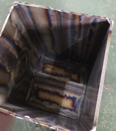 對于第三模塊中不銹鋼結構件的焊接,個(gè)人觀(guān)點(diǎn)是其焊接難點(diǎn)要更甚于鋁合金的焊接。眾所周知不銹鋼在高溫狀態(tài)下非常容易氧化,而且變形量也較大。這次的不銹鋼結構件組對完畢后,所有焊縫根據要求都不允許留間隙、開(kāi)坡口焊接,并在背部充氣的情況下實(shí)現單面焊雙面成型(如圖7),它的焊接難點(diǎn)之一首先是為防止變形,如何選擇好組對之后的焊接順序,其次是焊接過(guò)程中如何能夠保證一次焊接背部成型和表面焊縫成型不氧化,乍聽(tīng)起來(lái)好像這兩點(diǎn)有些矛盾,首先要想保證在不留間隙的情況向背面焊透,就要使熔池的溫度充分達到,而熔池溫度一旦過(guò)高焊縫表面就很容易氧化發(fā)黑,本屆比賽各路選手也是各顯其能,對于氬弧焊噴嘴的使用從6號嘴到10號甚至更大都有使用。其實(shí)從理論上來(lái)講,要想使氬弧焊接不銹鋼表面成型好,顏色好,主要就是氣體的保護效果,如果比賽允許使用氬氣保護拖罩進(jìn)行三重保護,即熱影響區也保護起來(lái),那么焊縫達到銀白色的金屬光澤也是有可能的,但這次只允許兩重保護(即內充氣和氬弧槍本身氣體),那么對于焊縫的正表面只能采取大口徑噴嘴進(jìn)行,才能擴大保護范圍,如果條件允許,也可以采用噴嘴內裝有濾網(wǎng)的大口徑噴嘴進(jìn)行焊接,這樣的氣體保護會(huì )更均勻。但前提是采用大噴嘴口徑的焊槍對焊接過(guò)程中選手對熔池觀(guān)察的視線(xiàn)會(huì )有所影響,也要逐漸適應。這次大賽對于大噴嘴的使用只有少數單位想到了這一點(diǎn)。隨著(zhù)本次大賽的結束,我想以后對于不銹鋼焊接的氧化問(wèn)題,會(huì )有更多的單位熟悉、掌握,甚至想出更好的辦法來(lái)解決不銹鋼焊接氧化的問(wèn)題。
